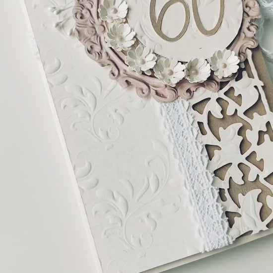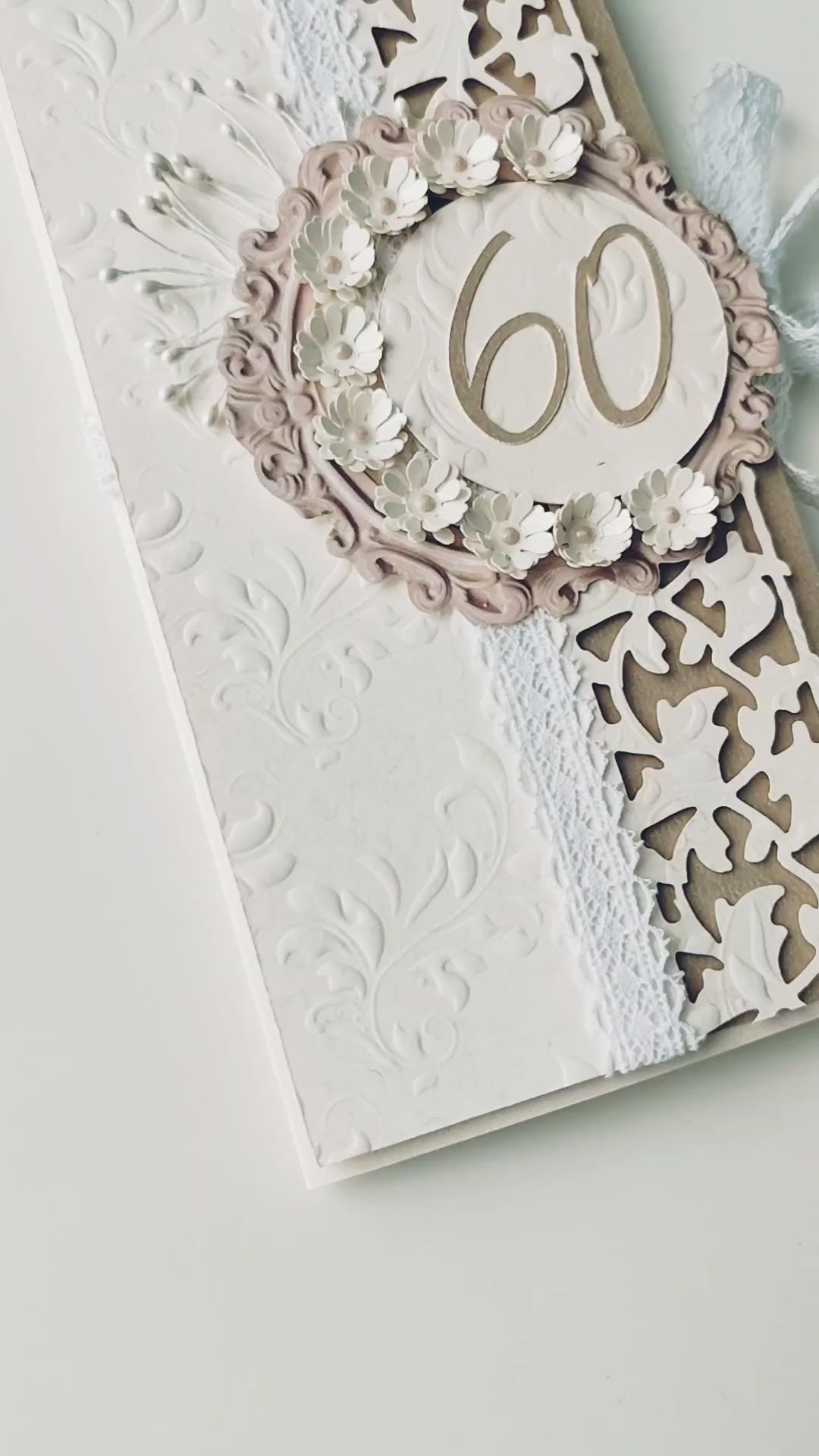 Išskirtinio dizaino rankų darbo atvirukas–vokelis, puikiai tinkantis sveikinimams jubiliejaus proga. Šis gaminys sujungia subtilią prabangą ir šilumą – jame dera reljefiniai raštai, ažūrinės detalės ir dekoratyvios gėlės. Atvirukas užrišamas dailiu nėriniuotu kaspinėliu, todėl atrodo itin šventiškai ir išskirtinai.
