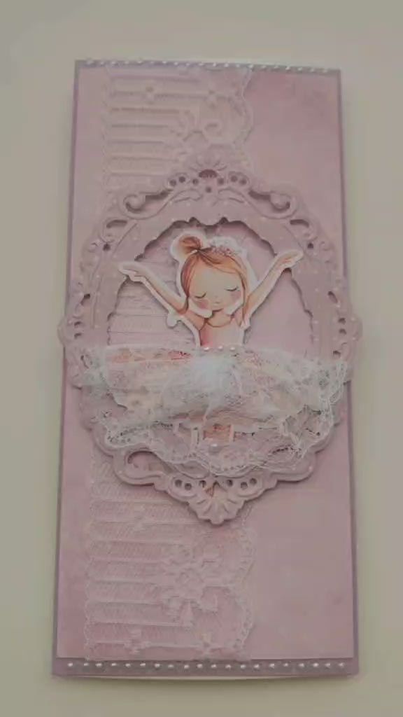 Atvirukas dekoruotas pastelinės rožinės spalvos detalėmis, ažūriniais ornamentais ir nėriniais, kurie suteikia prabangos bei lengvumo pojūtį. Centre – miela mažosios balerinos iliustracija, puošta sijonėliu ir perliukų akcentais. Subtilūs reljefiniai elementai ir kruopščiai suderintos tekstūros sukuria išskirtinį, rankų darbo įspūdį.