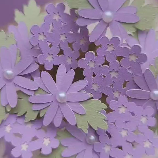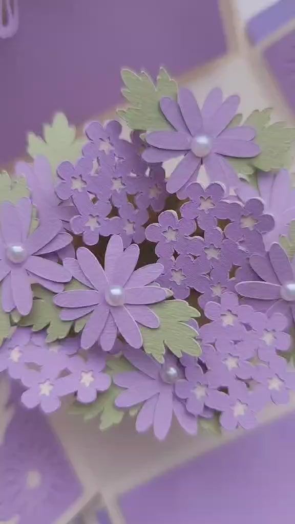 Viduje rasite kruopščiai išpjaustytas gėlių ir drugelių detales, dekoratyvines kišenėles žinutėms, pinigams ar dovanų kortelei, o centre - trimatę gėlių puokštę, kuri tampa pagrindiniu dėžutės akcentu.