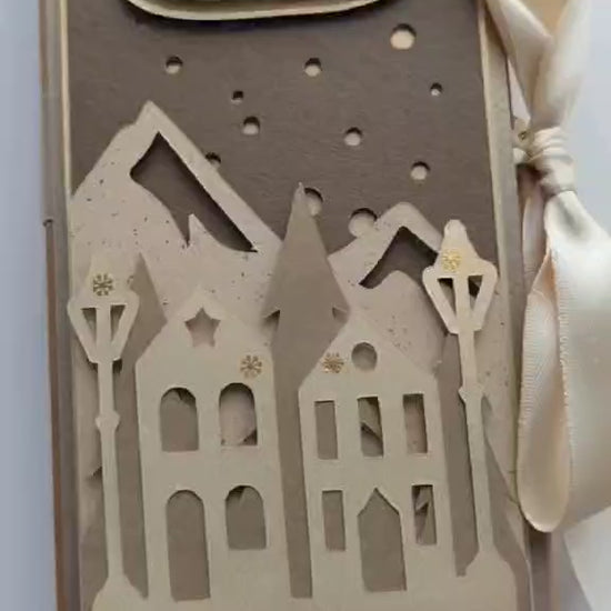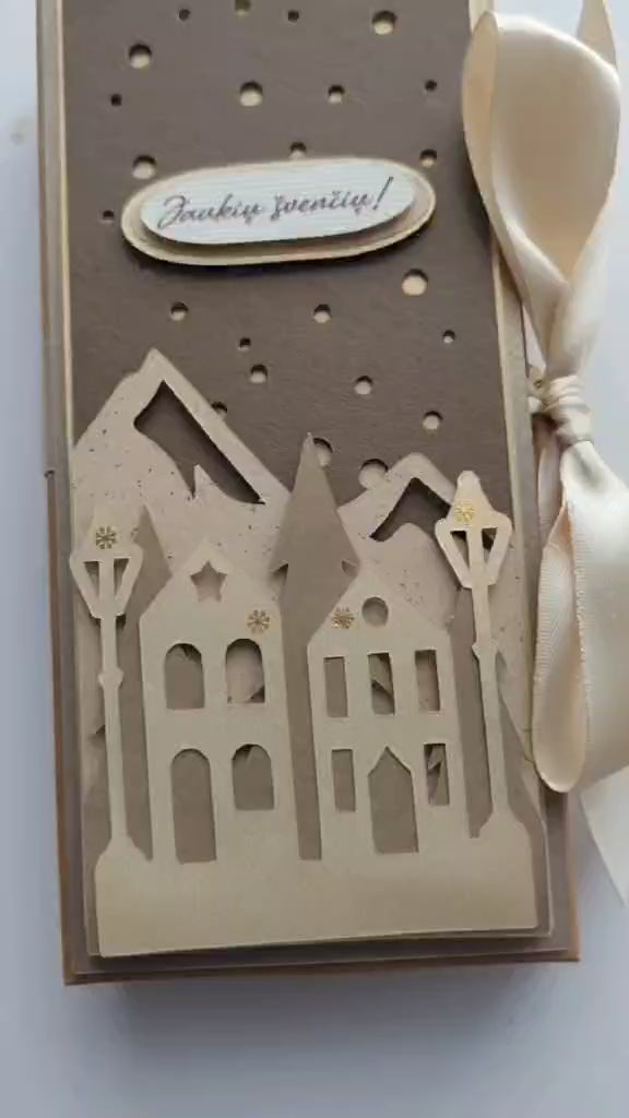 Dėžutės išorė dekoruota iškarpytomis namelių ir kalnų detalėmis, subtiliomis aukso spalvos žvaigždutėmis bei prabangiu kaspinu. Ant viršelio užrašas „Jaukių švenčių!“ suteikia šilumos ir šventinės nuotaikos.